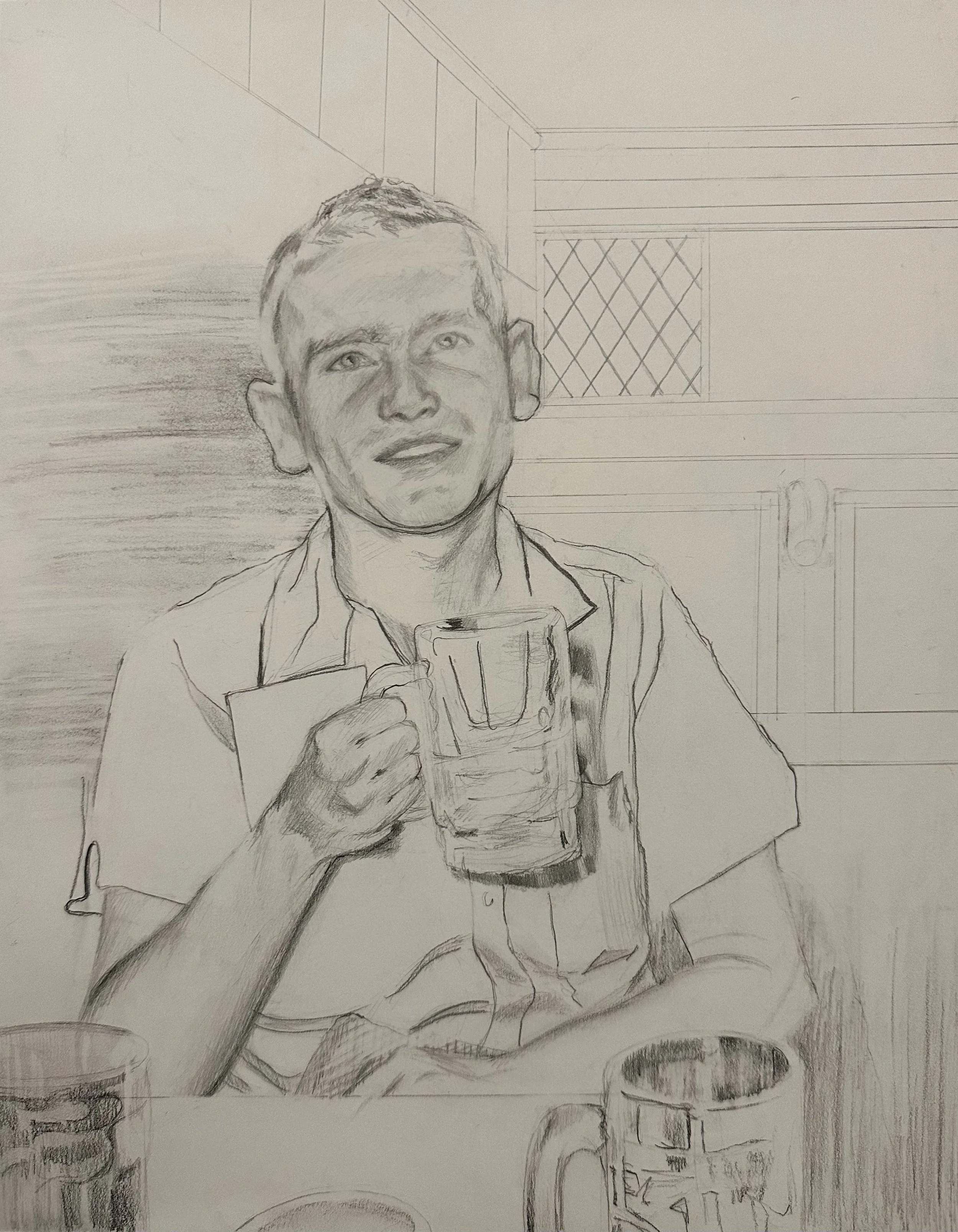 In the Pub, 2025, graphite on paper, 11 x 14 in.